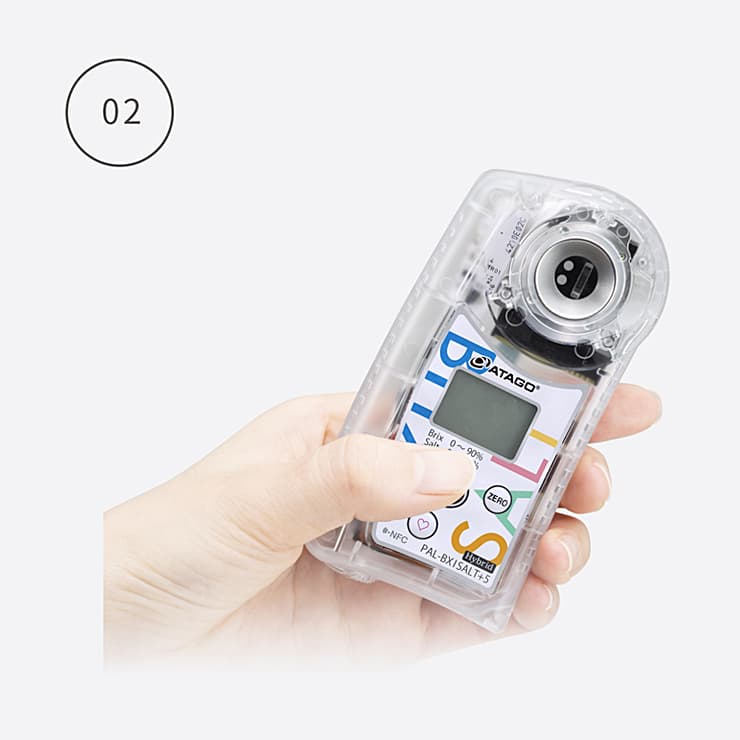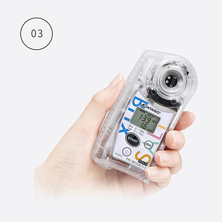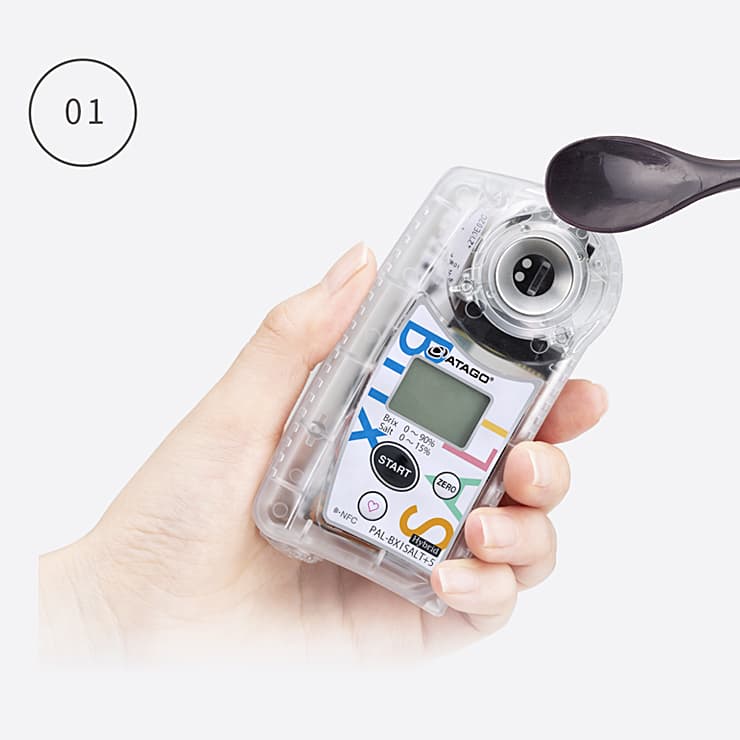 This is a hybrid of refractometer and salt meter which has an optical prism is used to measure the concentration (Brix) and titanium electrode is used to measure the salt contents. It enables to check the balance between concentration(Brix) and salt that is the decisive factor for taste in foods in general. In addition, we pursued the elimination of the dilution which is required for salt measurement especially for the concentrated samples like sauce. Now, the salt concentration of samples with high concentration such as sauce can be measured without dilution.