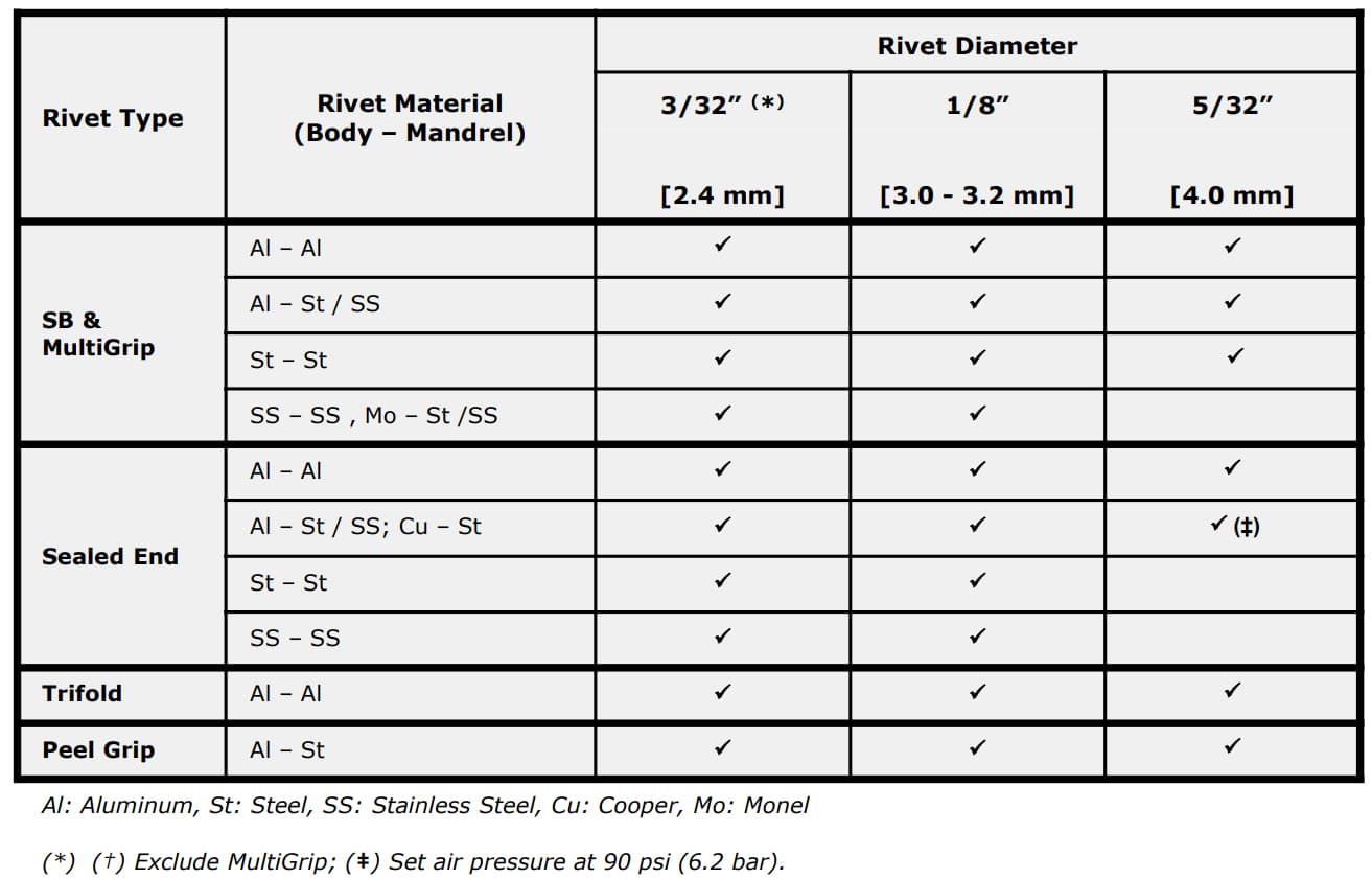 | Blind Rivet Setting Capacity (mm) | 2.4 - 4.0 mm |