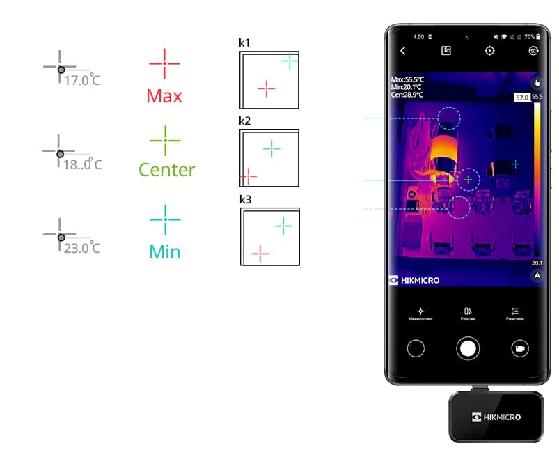 ![]() Quick Temperature Measurement Full screen measurement: Center Spot, Hot Spot, Cold Spot, 3 Custom Spots and 3 Areas. |