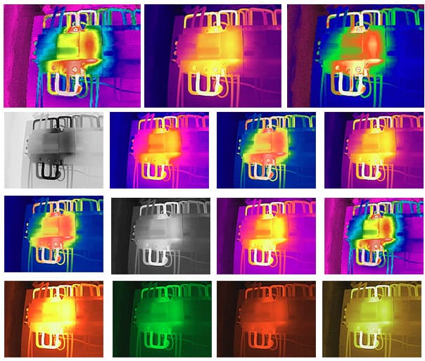 - Color Palettes: White Hot, Black Hot, Rainbow, Ironbow, Sepia, Color, Ice Fire, Rain, Red Hot, Green Hot, Dark Blue, Combined