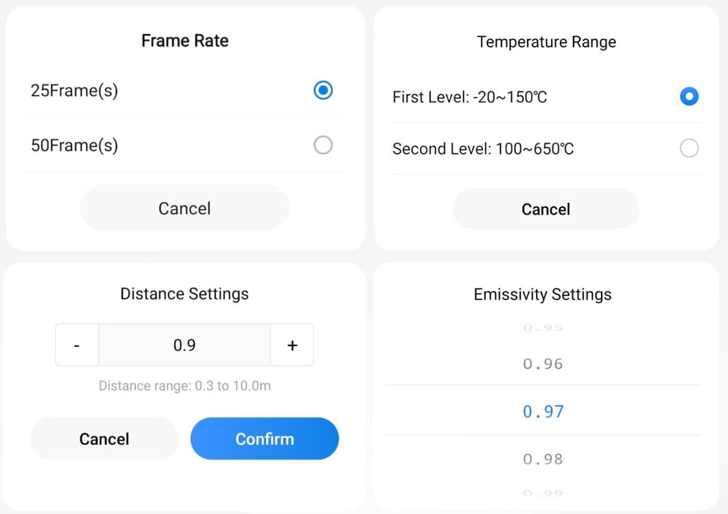 ![]() Multiple Professional Settings Providing professional settings like emissivity/distance/range of your thermal camera allows you to get the best thermal imaging images and temperature readings of different surfaces. |