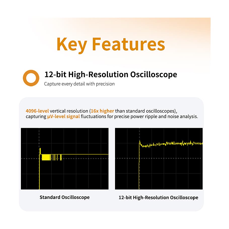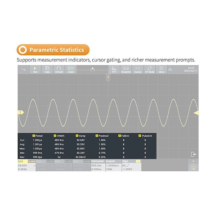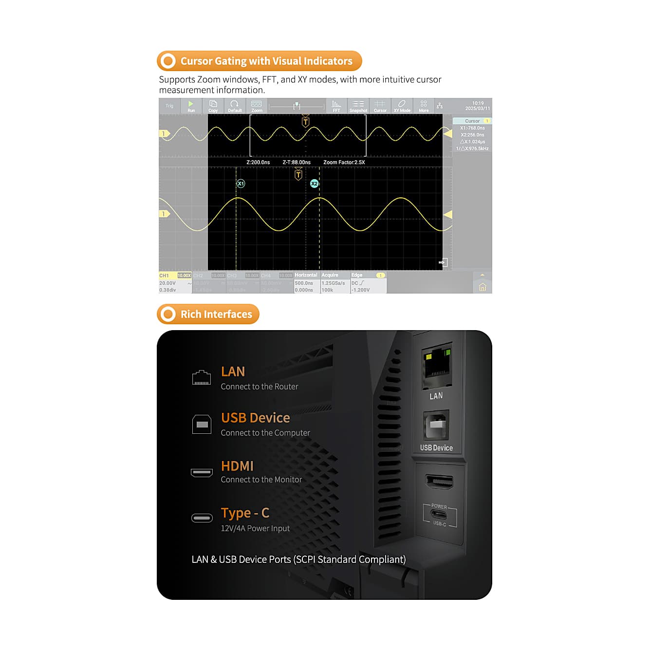 - 50M storage depth, up to 700,000wfms/s waveform refresh rate, ensuring clear signal capture.