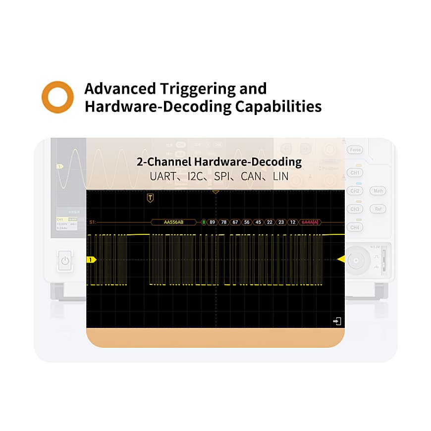 - Rich triggering: edge, video, pulse width, slope, under-amplitude, over-amplitude, timeout, Nth edge, logic and RS232/UART, l2C, SPI, CAN, LIN; 2-channel hardware decoding: RS232 / UART, I2C, SPIl, CAN, LIN.