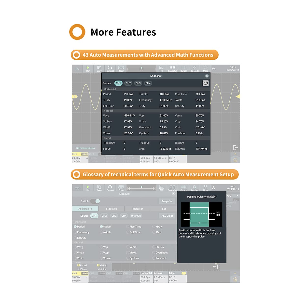 | Auto measurement | Period, Frequency, +Width, -Width, Rise Time, Fall Time, Scr Duty, +Duty,-Duty, Vavg, Vpp, VRMS, Overshoot, Vmax, Vmin, Vtop, CycRms, Vbase, Vamp, Preshoot, Std Dev, +Pulse Cnt, -Pulse Cnt, Rise Cnt, Fall Cnt, Area, Cyc Area, Delay(A↑-B↑), Delay(A↑-B↓), Delay(A↓-B↑), Delay(A↓-B↓), Phase(A↑-B↑), Phase(A↑-B↓), Phase(A↓-B↑), Phase(A↓-B↓), FRR(A↑-B↑), FRF(A↑-B↓), FFR(A↓-B↑), FFF(A↓-B↓), LRR(A↑-B↑), LRF(A↑-B↓), LFR (A↓-B↑), LFF(A↓-B↓) |