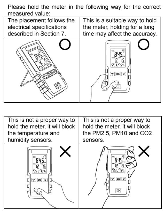 This meter can make 5 measures of air quality once a time, including CO2, PM2.5, PM10, temperature and humidity. The measurement for CO2 is used for the air exchange rate of total heat exchangers or other ventilation fans or systems, The measurement for PM2.5 or PM10 is used for the cleaning capacity of air purifiers and the measurement for temperature and humidity is used to estimate the dehumidification effect of dehumidifiers.