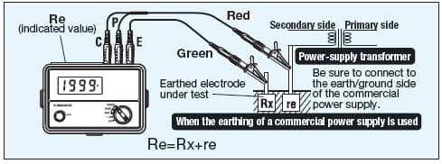 | 2-Pole Earth Resistance Value Measurement (Simplified Measurement) A simplified 2-pole measuring method can be used if there is an almost perfectly earth/ground object such as a lead or iron water-pipe (plastic pipes cannot be used) or if there is an object with a known value of earth resistance, near the measurement site. |
