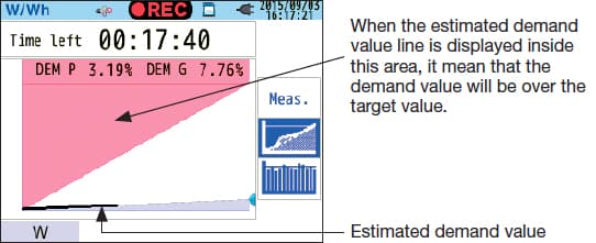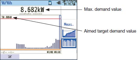Demand measuring Demand is the average power value of a specific period (usually 30 minutes). The contract with the power supplier conditionally concerns the maximum average power value between a period for the consumption fee. This function supports how to maintain within the target consumption by monitoring the estimated demand value to the setting rate with the maximum demand value. |