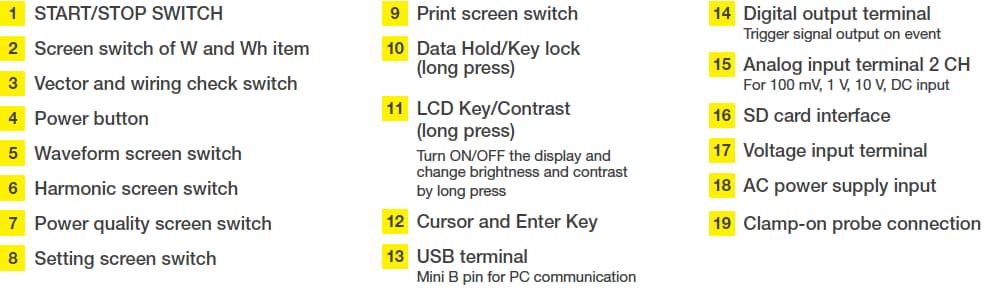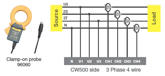 Power line and Input Channel: 3 CH Voltage, 4 CH for Current Clamp Probe. 1P2W (up to 4 systems), 1P3W (up to 2 systems), 3P3W2current (up to 2 systems), 3P3W3current, 3P4W |