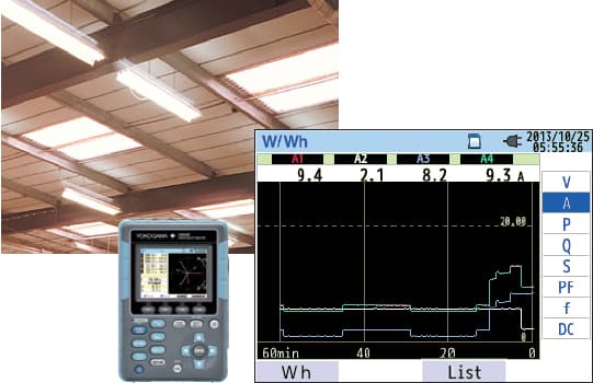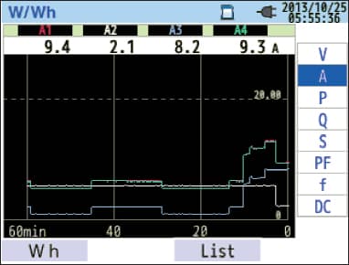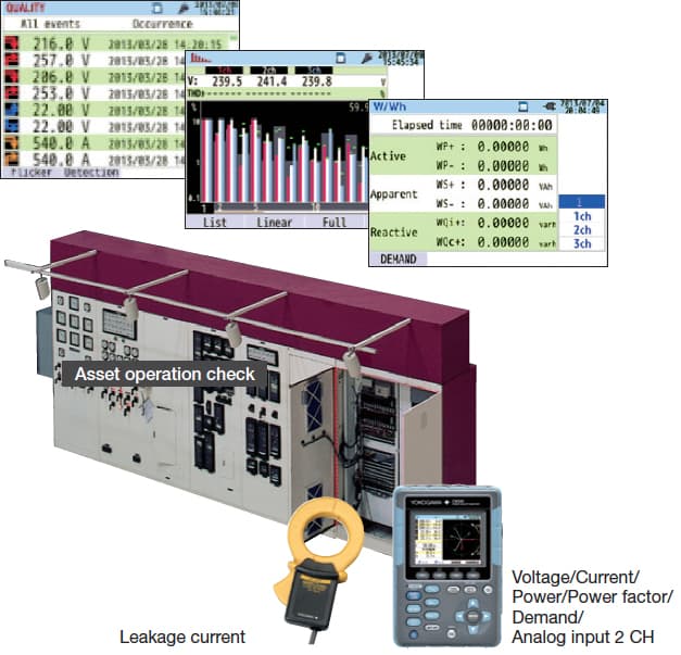 The CW500 not only continuously measures harmonics but it also captures malfunctions of the power line and records the occurrence time with waveforms. Simultaneously, it can measure the power and leakage current of a neutral phase. Additionally, users can confirm the condition of assets when signals are connected to the DCV input channels. |