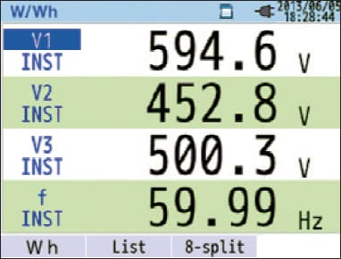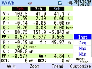 Power measuring item: (Instantaneous, average, maximum, and minimum values for each setting period) Voltage/Current/Power (Active, Reactive, Apparent)/Power Factor/ Phase Angle/Frequency/Calculated Phase Shift Capacitance/DC voltage value 2 CH. |